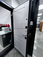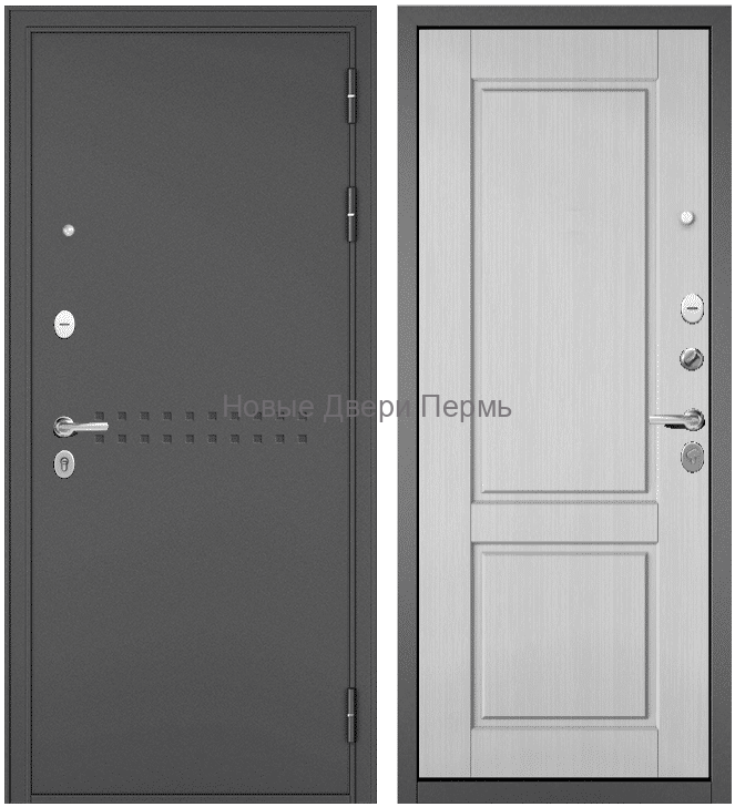 Дверь TRUST MASS MP 9SD-1: наружная отделка — Графит букле, внутренняя — Ларче белый. Толщина 90 мм, утеплённая, два замка, высокий класс безопасности.