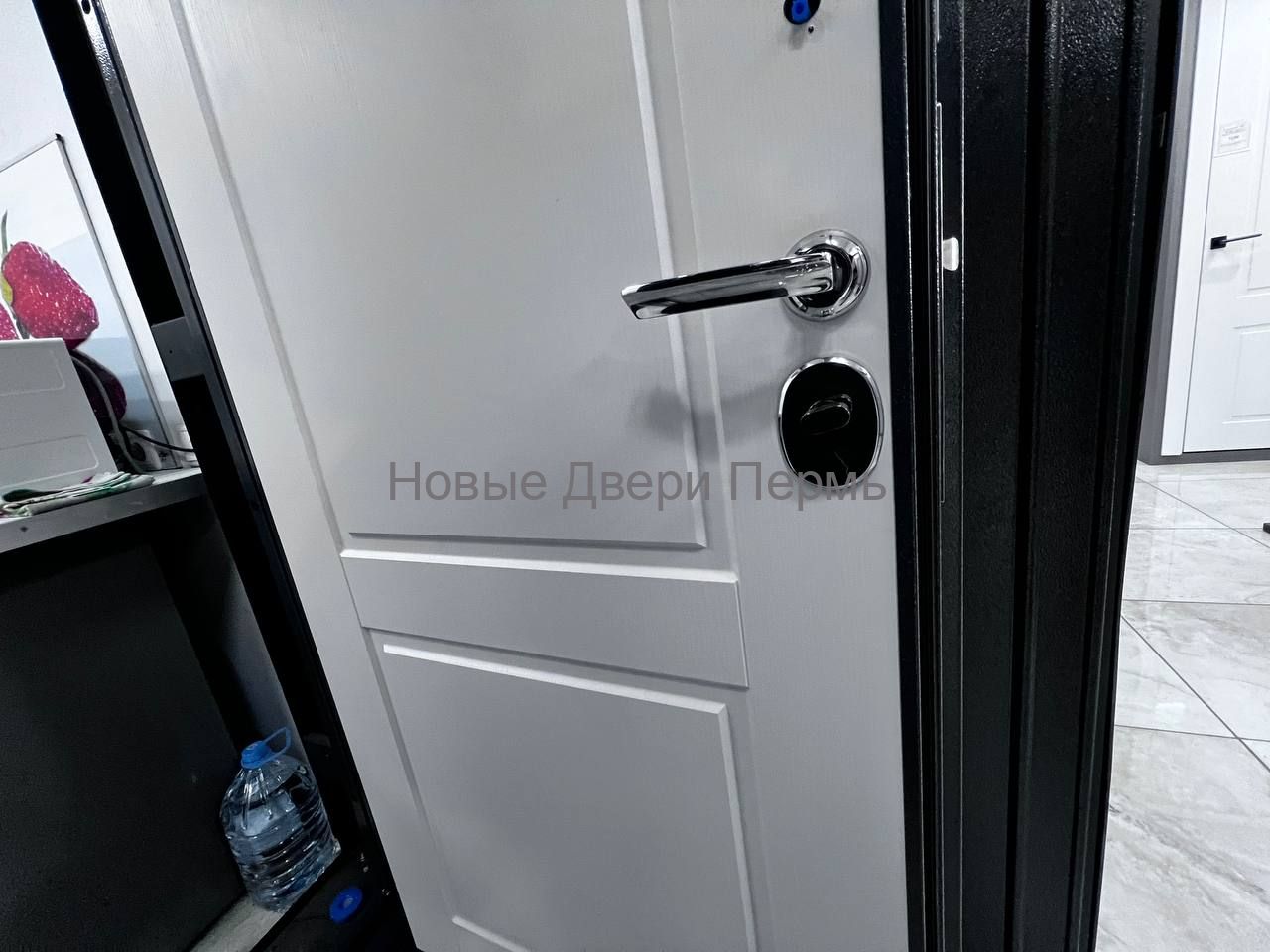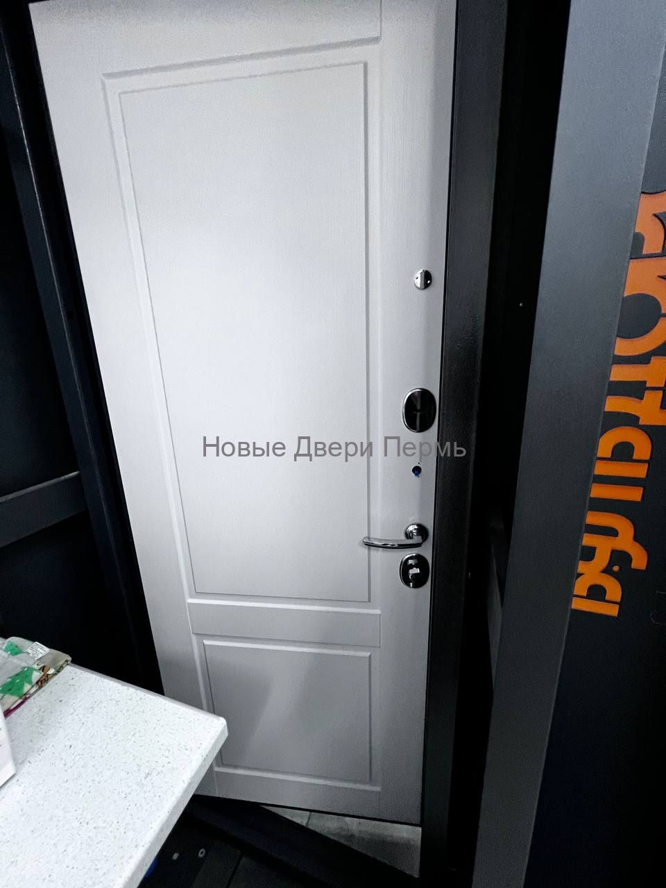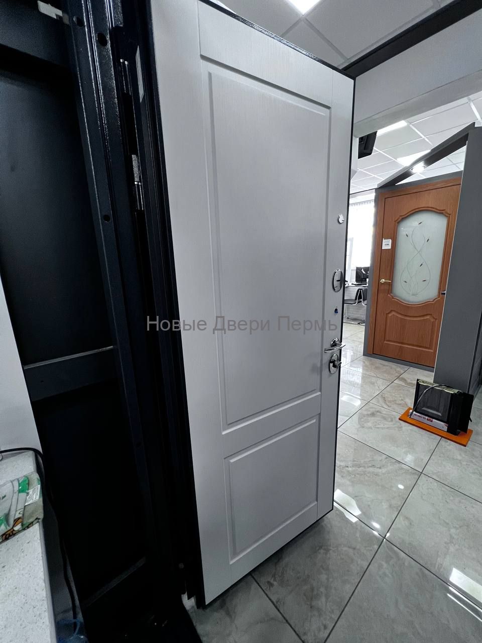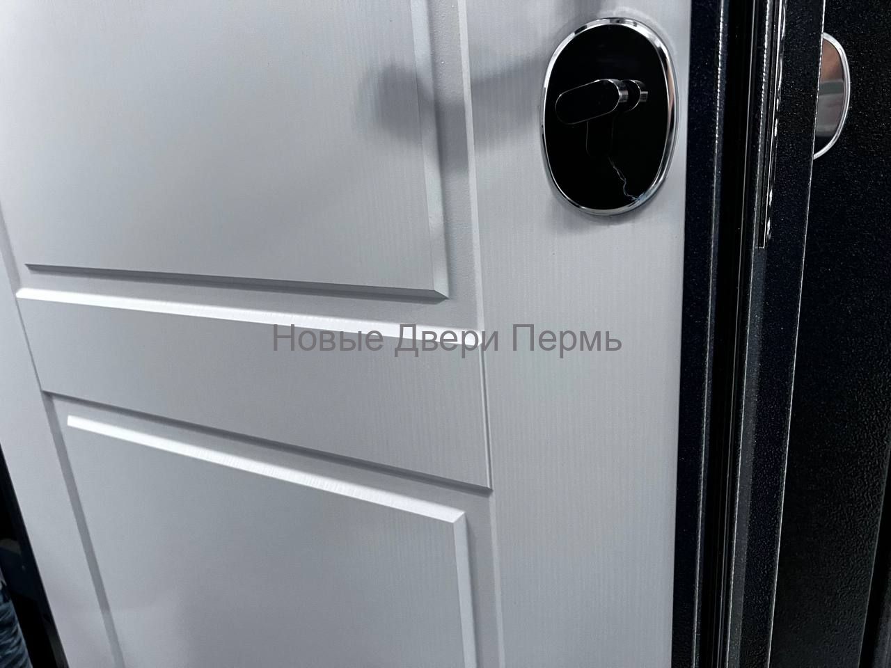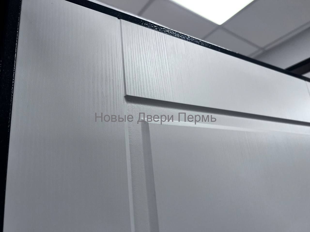 Дверь TRUST MASS MP 9SD-1: наружная отделка — Графит букле, внутренняя — Ларче белый. Толщина 90 мм, утеплённая, два замка, высокий класс безопасности.