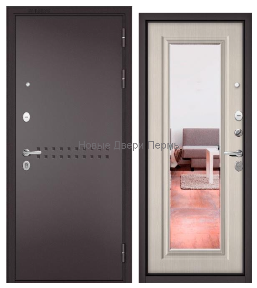 Внутренняя декоративная панель МДФ 16 мм выполнена в цвете Ларче бьянко и дополнена зеркалом во весь рост, которое делает интерьер светлее и визуально просторнее. Наружная сторона оформлена в стильном оттенке Букле шоколад, подчеркивающем премиальный внешний вид двери.