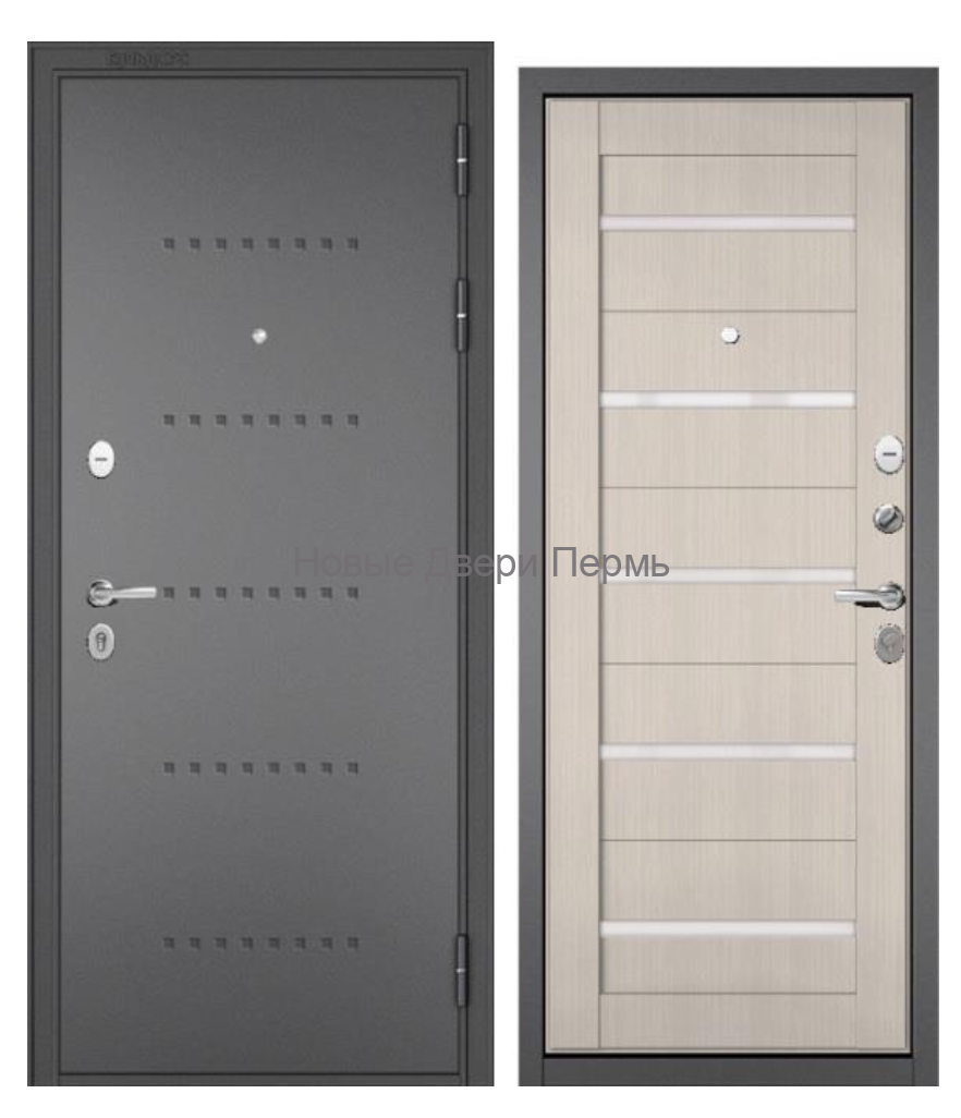 Модель оснащена трёхконтурной системой уплотнения, предотвращающей проникновение холода, пыли и шума. Внутреннее наполнение выполнено из базальтовой плиты, отличающейся высокой теплоизоляцией и огнестойкостью. Внутренняя декоративная панель МДФ 16 мм в оттенке Ларче бьянко придаёт интерьеру светлый и современный стиль, а наружное покрытие Антрацит букле подчёркивает солидность и устойчиво к атмосферным воздействиям.