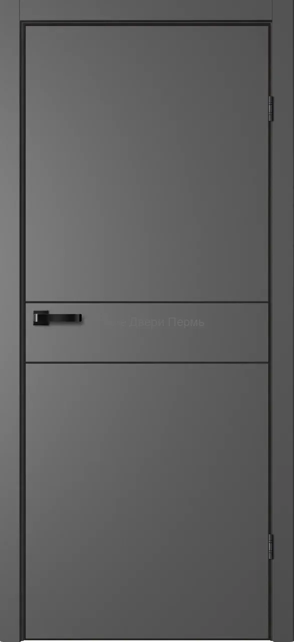 Дверь NEO 3 в стиле минимализм с остеклением и молдингом на уровне полотна. Эмалит графит, анодная алюминиевая кромка, встроенный магнитный замок.