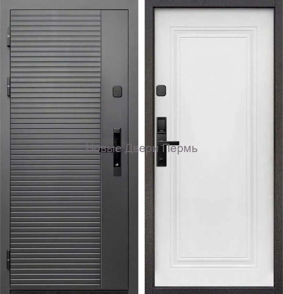 Дверь входная Тайга 10 2МДФ с электронным замком - это люксовая, премиальная металлическая дверь с внешним покрытием из фрезерованной МДФ-панели 10 мм в цвете "Сатин Графит", и внутренней панелью из фрезерованной МДФ-панели 10 мм в цвете "Эмалит Белый".