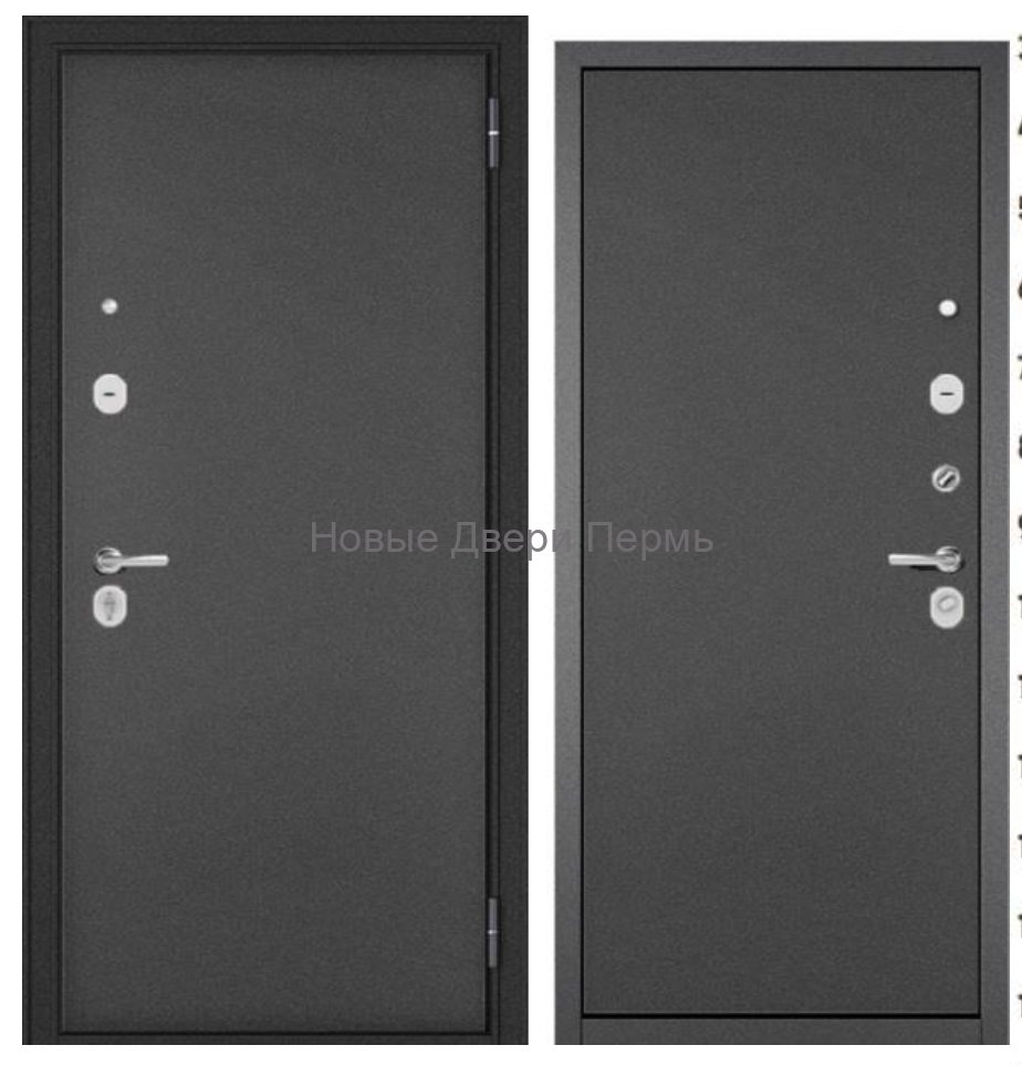 Модель выпускается в двух вариантах: Антрацит букле — современный графитовый оттенок, и Медь — тёплый классический цвет с металлическим блеском. Фурнитура включает хромированную ручку 0593, глазок, противосъёмные ригели и декоративную накладку на замок.